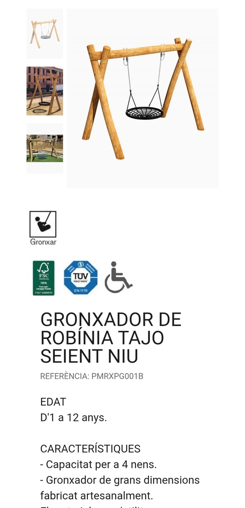 Gronxador seient niu: 2.000 €. Exemple: https://happyludic.com/ca/parcs-infantils/2701-gronxador-de-robinia-tajo-seient-niu.html