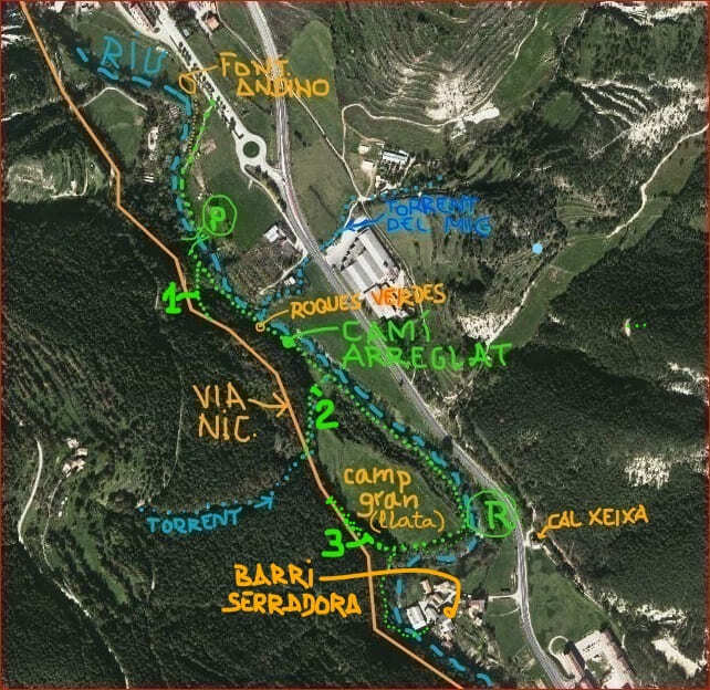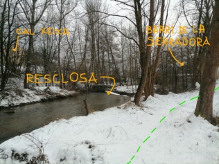 A la resclosa, es pot vorejar el gran camp de la Llata fins a trobar una pista amb 2 opcions: baixar fins a Terradelles Vell (creuant el riu per gual) o pujar fins a la Via Nic.
