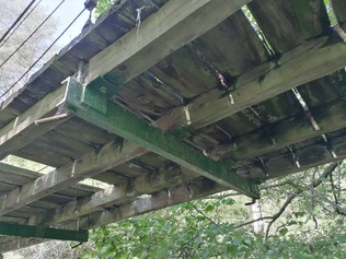El cablejat penjant i perfils metàl•lics de sota els taulons longit. estan en bon estat, però hi ha forats a les travesses i se'n van perdent.